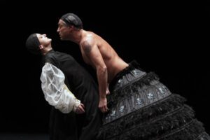 Rimbalzano in maniera animata i sentimenti di avidità e ipocrisia dei familiari e dei sudditi che circondano il sovrano malato, che si sente solo e senza speranze. Si aggrovigliano i plastici corpi grotteschi ma flessuosi in movimento, che volteggiano, si rincorrono con i precisi movimenti di bravi attori e attrici, ma sempre lievi e allenati al suono della bella musica che li accompagna, come in un’operetta lirica o in uno spettacolo danzante.