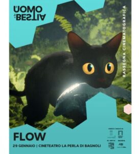 Proiettato nell’ambito della rassegna cinematografica ideata da Antonietta De Lillo L’uomo e la bestia al Cineteatro La Perla di Napoli il 29 gennaio scorso per il matinée delle scuole (replica il 14 febbraio nella sala di Bagnoli), Flow è riuscito a tenere incollati alla poltrona grandi e piccini. Senza nemmeno una parola proferita per tutta la pellicola, seguendo le (dis)avventure di un gattino nero in un mondo post apocalittico.