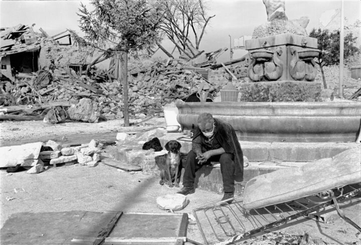 Nell’immagine di copertina, la desolazione che circonda quest’uomo e il suo cane, ad esempio, è fortemente evocativa. Tutto è crollato intorno a lui, e l’anziano è fermo al centro di quella che probabilmente era una piazza, mostrando la dignitosa disperazione che colse centinaia di migliaia di persone. Forse sta aspettando i soccorsi, e proprio la sua figura sembra rappresentare ciò che scrisse Moravia poco dopo il terremoto: “Si sente la rabbia di chi ha aspettato minuto per minuto, secondo per secondo, i soccorsi, prima con un sentimento di certezza, poi con speranza, poi con stupore, poi con incredulità, poi alfine con disperazione vera, assoluta e profonda.”