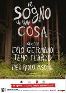 Il Teatro Bolivar di Napoli chiude la stagione 23/24 firmata dalla direzione artistica Nu’Tracks, con una coppia d’eccezione. Elio Germano e Teho Teardo, domenica 28 aprile 2024, saranno i protagonisti di  Il sogno di una cosa, spettacolo liberamente tratto dal capolavoro di Pier Paolo Pasolini, in scena in una versione di parole e musica.