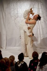 “La storia prende vita nel linguaggio universale del corpo, della musica e della danza – riferiscono le autrici ed interpreti – In uno spazio completamente bianco, si racconta di qualcuno che c’è e di qualcuno che arriva. Del mio e del tuo, dell’arrivo dell’altro, del diverso da me, di una nascita e di un accudire, dell’attesa e della sorpresa, di uno strano uovo che si schiude. E poco importa se dall’uovo non uscirà un delicato uccellino, ma un drago sgraziato e grandissimo dagli occhi oro. L’inatteso non farà paura: insegnerà a crescere, a cambiare a prepararsi al mondo nuovo”.