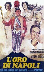 “L’Oro di Napoli”: sei episodi, tratti dall’omonima raccolta di racconti di Giuseppe Marotta, sceneggiato insieme al regista da Cesare Zavattini è prodotto da Carlo Ponti e Dino De Laurentiis. Presentato in concorso a Cannes nel 1955, viene premiato ai Nastri d’argento per la miglior attrice a Silvana Mangano e per il miglior attore a Paolo Stoppa. Con ironia e realismo, i personaggi rappresentano le vite quotidiane dei napoletani, esaltandone le virtù, i vizi, e la straordinaria umanità. Tra i più celebri, l’episodio “Pizze a credito”, vede protagonista una giovanissima Sophia Loren nel ruolo di Sofia. Una pizzaiola che, con il suo fascino e la sua avvenenza, incanta il quartiere mentre lavora insieme al marito. Un altro episodio memorabile è “Il guappo”, dove Totò è sottomesso da un guappo ,che tiranneggia lui e tutta la sua famiglia, fino a quando dopo tanti anni trova il coraggio di ribellarsi.