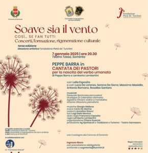 La terza edizione della rassegna Soave sia il Vento si conclude martedì 7 gennaio 2025, alle ore 20.30 presso il Teatro Tasso, a Sorrento, con un evento di rara intensità artistica: La Cantata dei Pastori, scritta da Peppe Barra e Lamberto Lambertini e interpretata dallo stesso Barra, uno degli ultimi grandi maestri del canto e del teatro italiano del Novecento.
